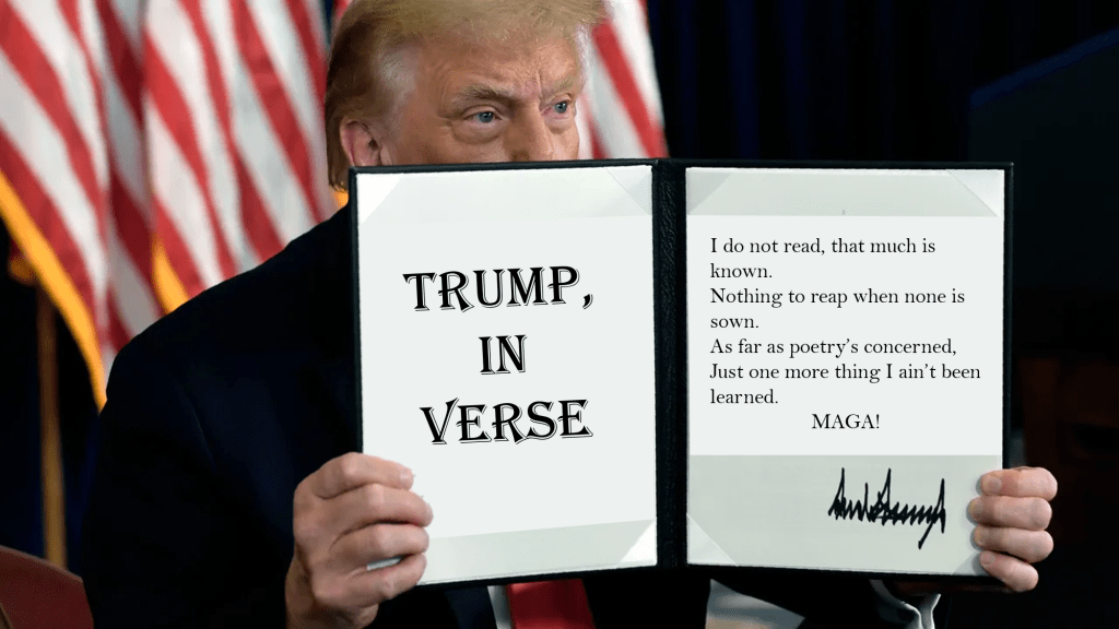 Here you will find commentary on a variety of the appalling actions of the Trump administrations (v1.0 and v.Project2025). All are expressed via light verse — a favored literary device; poetry written to amuse and entertain — and mostly shared as if DJT were the author.